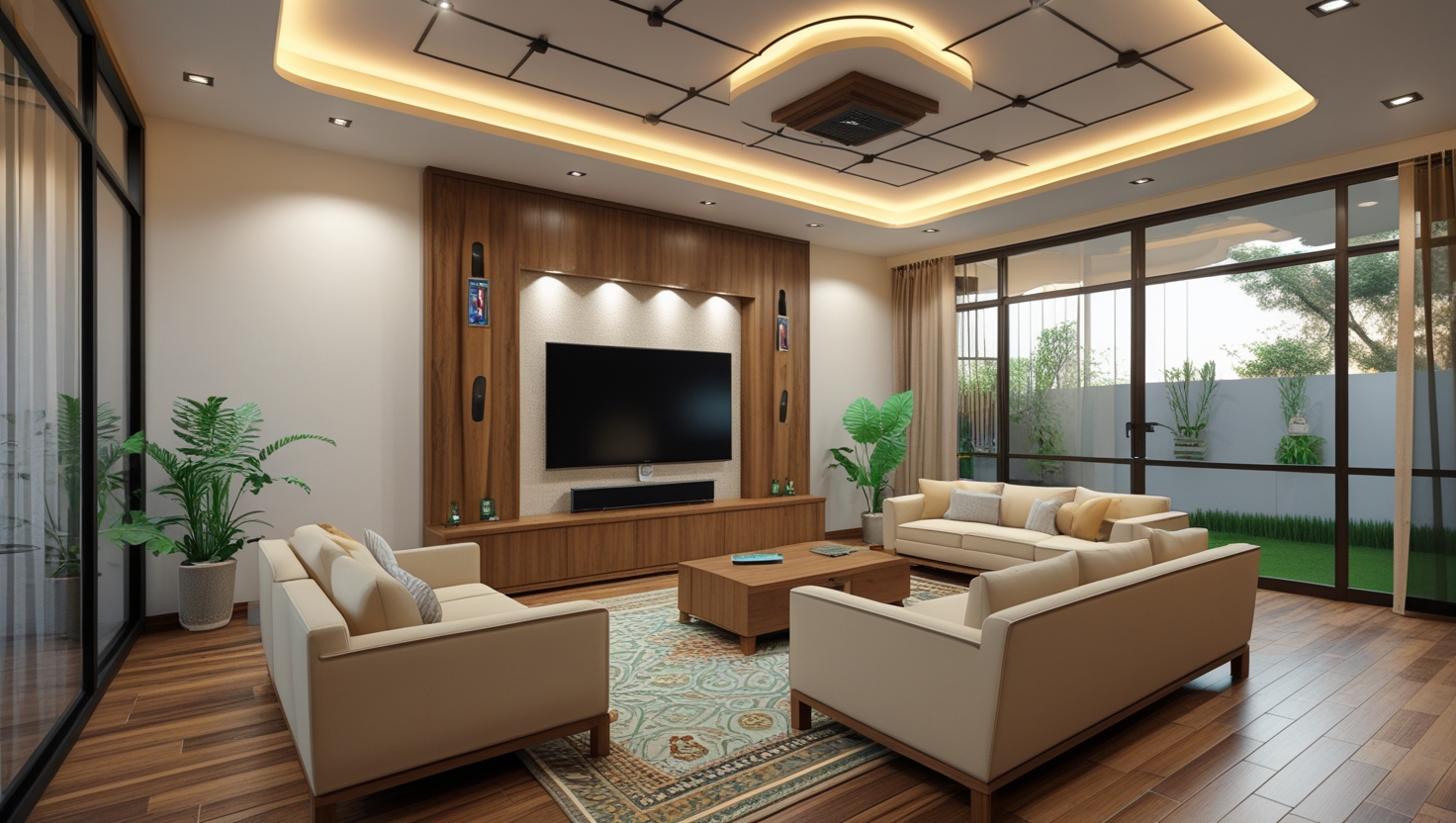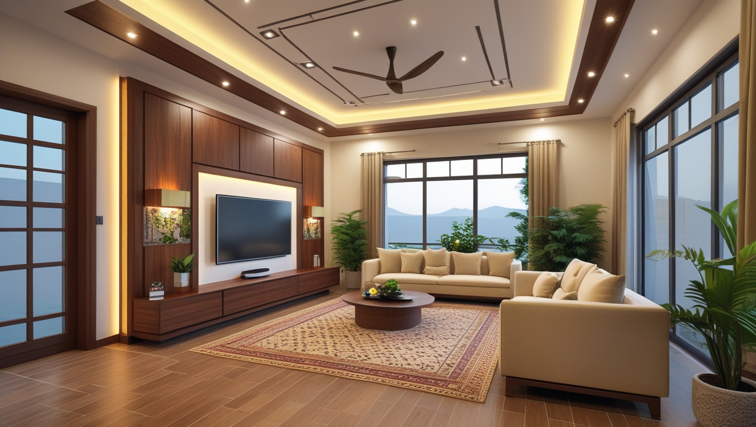 - Ceilings: POP false ceilings with LED strips and ceiling fans